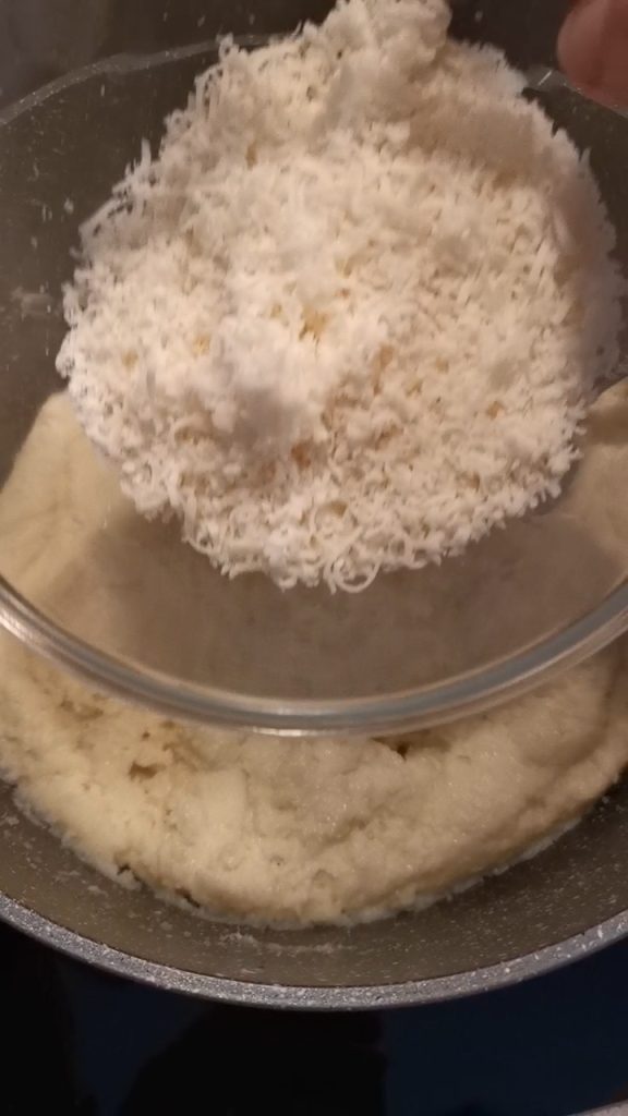 Dos 60g de queijo necessários, a meu gosto fiz: 30g de parmesão e 30g de pecorino.
