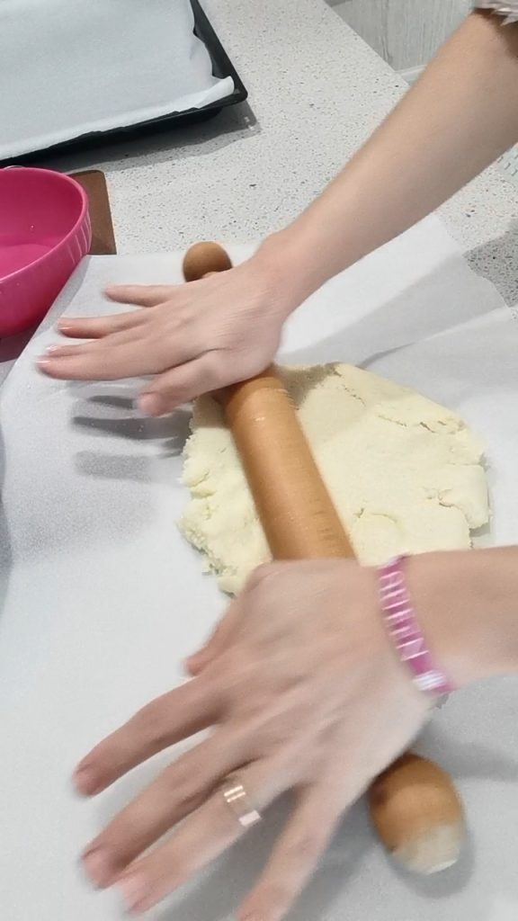 Transfira o composto para uma superfície de trabalho, estenda com o rolo de massa ou com as mãos, previamente umedecidas.