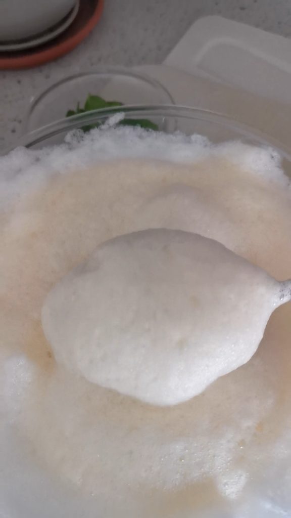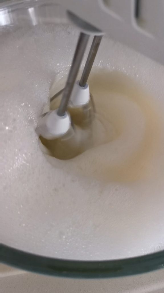Em um recipiente, despejamos nossa clara de ovo que iremos bater em neve, como se fosse preparar um bolo.