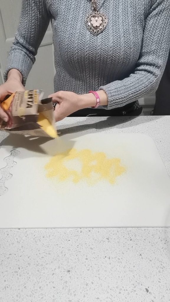 - q.b. farinha de milho e cereais para polenta instantânea (para a bancada)