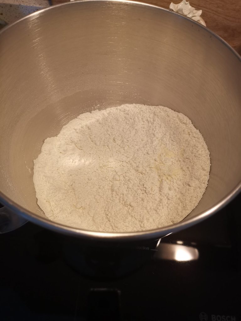 Eu usei a batedeira, mas a massa pode ser feita tranquilamente à mão. Será necessário uma superfície para amassar ou um recipiente grande e um robô ou liquidificador.