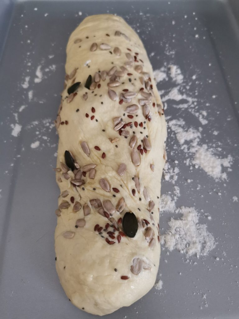 Geralmente faço um com sementes mistas e dois básicos. O com sementes eu faço rolar entre a fruta seca espalhada na bancada, unto um pouco as mãos, passo no filão e depois faço deslizar entre as sementes até que estejam bem fixas no pão.