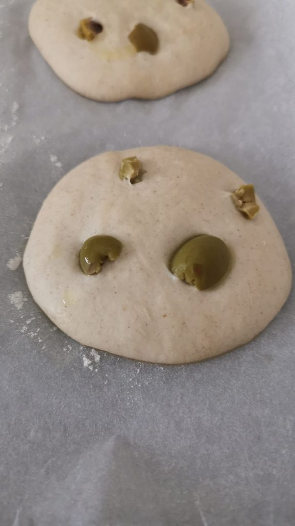 Passado o tempo necessário, retomamos a massa, colocamos farinha na bancada (senão, por ser muito macia, grudaria) e fazemos algumas dobras. Formamos nossos pãezinhos, colocamos sobre a assadeira, que teremos forrado com papel manteiga e polvilhado com farinha e, se preferir, deixe-os simples ou adicione azeitonas verdes na superfície, empurrando os pedaços um pouco para dentro da massa.