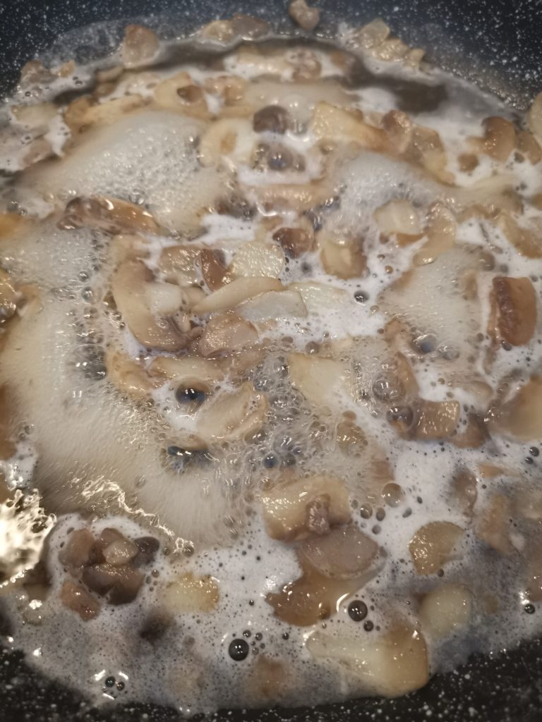 Em uma frigideira refogamos por alguns minutos os cogumelos champignon, até que liberem a água.