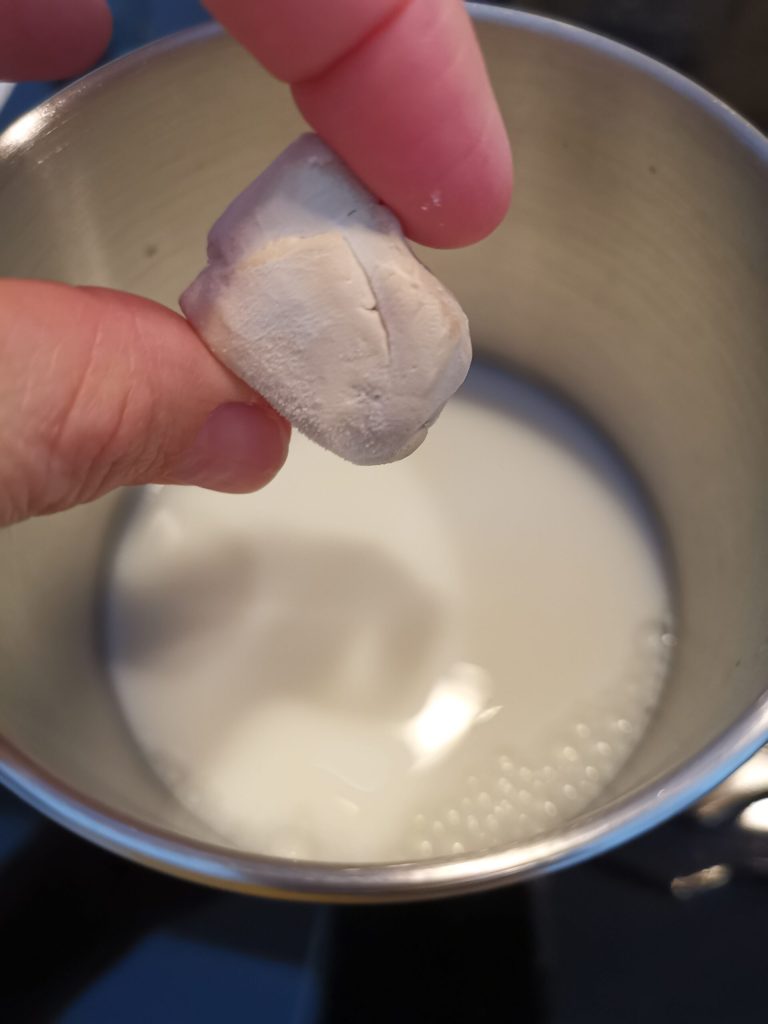 Uma vez que estão bem espumosos, adicionamos o leite morno, no qual dissolvemos o fermento biológico.