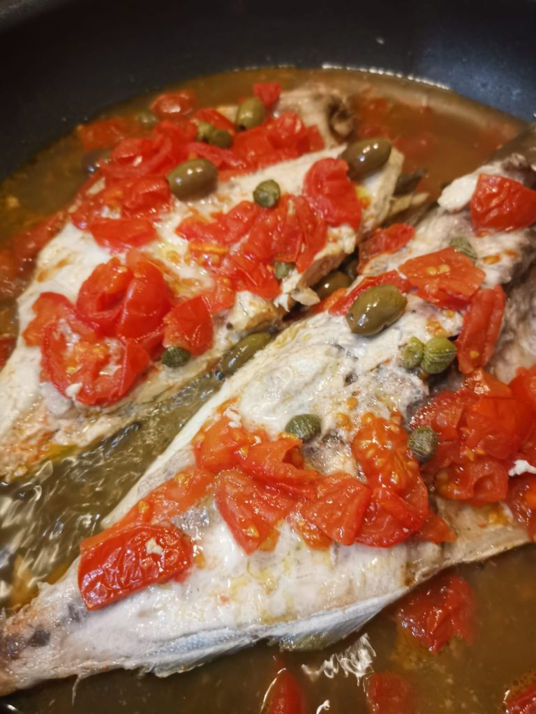 A seriola na frigideira, macia e delicada, combina perfeitamente com a doçura dos tomatinhos e o sabor marcante das alcaparras e das azeitonas, criando um prato equilibrado e realmente irresistível.