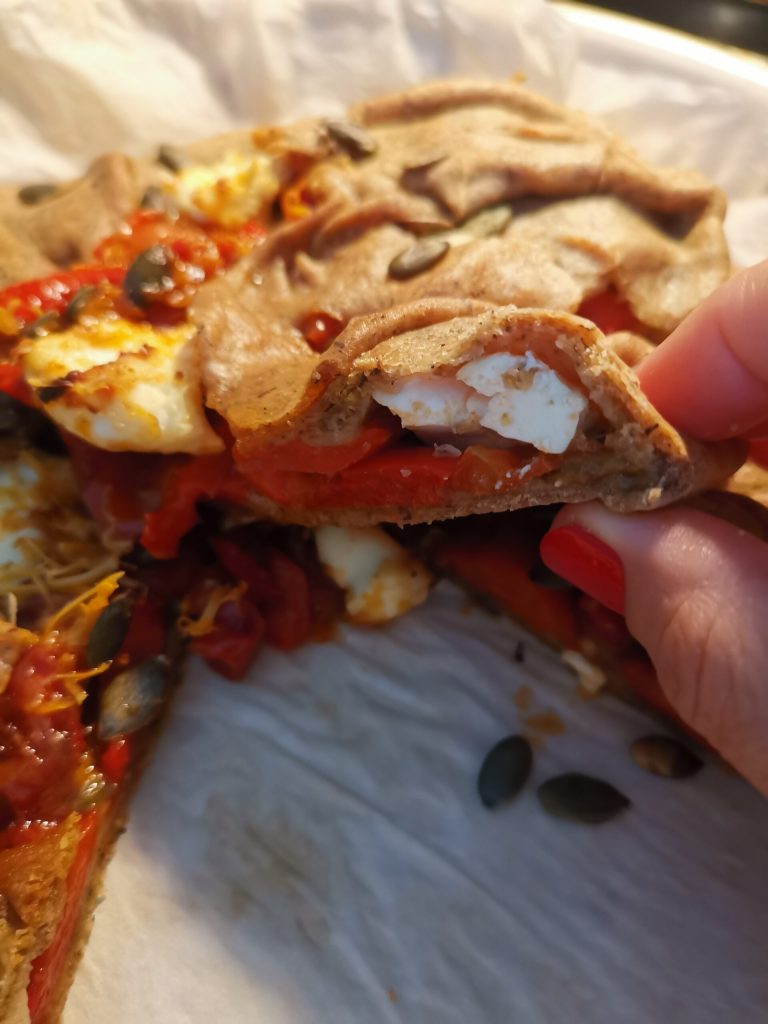 Neste ponto, dobre as bordas para dentro da torta e polvilhe com parmesão e, se gostar, algumas sementes. Usei sementes de abóbora. Embora pequenas, elas oferecem muitos benefícios para nosso corpo. No final da receita, adicionarei algumas informações adicionais sobre seu uso e consumo.