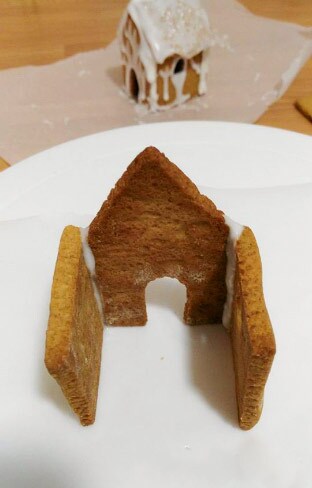 Para preparar a casinha, cortamos todas as partes e colocamos sobre uma assadeira, levamos ao forno a 180º. Uma vez que os biscoitos estejam frios, preparamos o glacê real e começamos a montar a casinha.PREPARAÇÃO DO GLACÊ:
