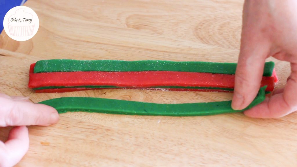 Pincelamos as tiras com a clara de ovo batida e as unimos de 3 em 3, alternando as cores. Agora abrimos uma folha de massa e embrulhamos bem o pedaço de tiras coloridas que criamos.