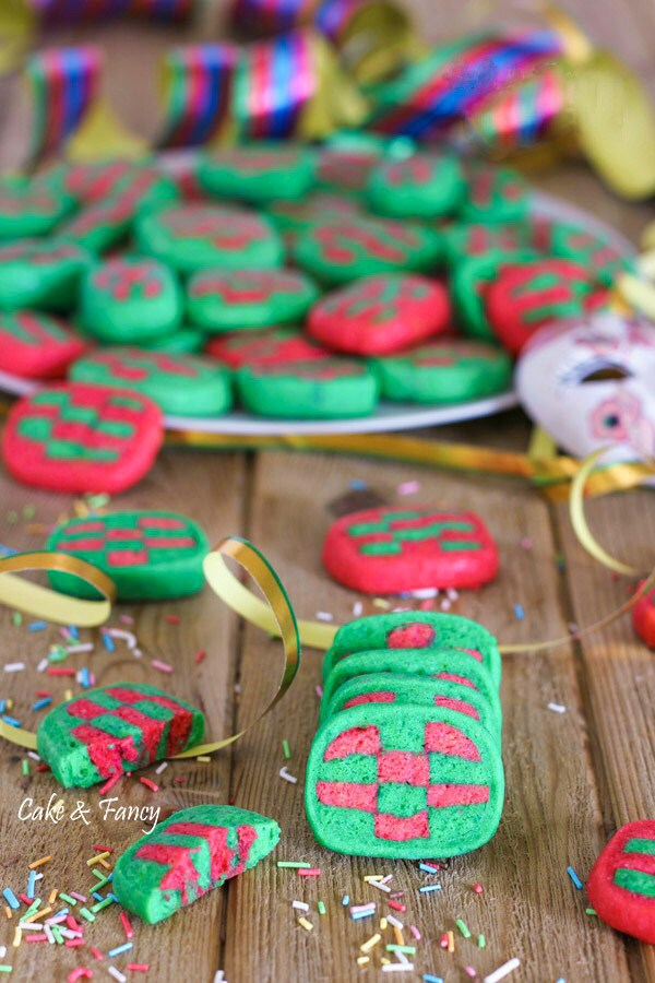 Os Biscoitos coloridos de carnaval são saborosos e bonitos de ver, agradam muito aos pequenos, especialmente por suas cores vivas. Não é preciso muito, basta fazer a massa e adicionar o corante preferido para torná-los assim divertidos. Esses biscoitos não têm um procedimento difícil; só é preciso um pouco de paciência para montar as tiras de massa, que devem ser alternadas nas duas cores para obter este maravilhoso efeito quadriculado.