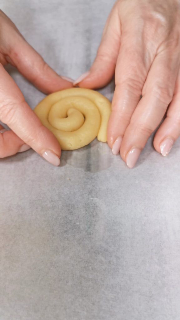 Após o tempo de descanso, cortamos pequenos pedaços de massa “cerca de 80/100 g” dependendo do tamanho desejado dos biscoitos de coelhinho. Criamos um rolinho e enrolamos sobre si mesmo, depois fazemos 2 bolinhas, uma grande para a cabeça e outra pequena para o rabo. Finalmente, as orelhas, montamos todas as partes pincelando com clara de ovo.