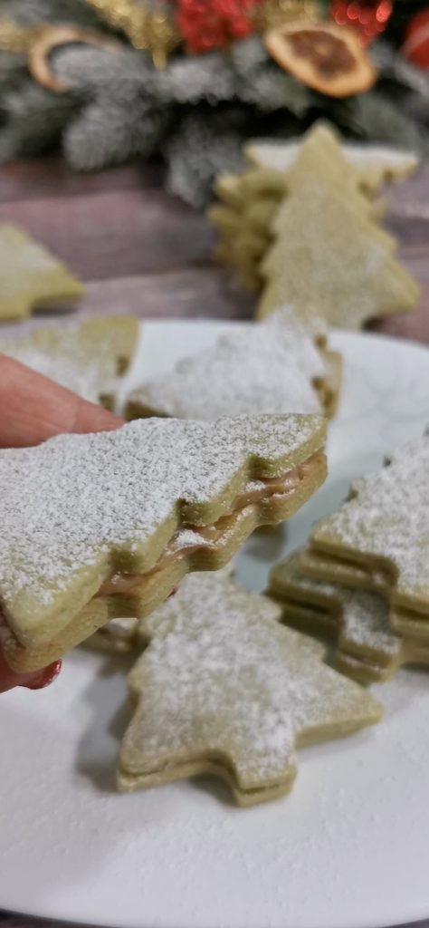 Os biscoitos de Natal com chá matcha são deliciosas arvorezinhas de cor verde brilhante, são dessa cor porque são preparados com o pó de chá japonês. O pó de chá japonês é conhecido por suas múltiplas e benéficas propriedades, e é produzido utilizando apenas folhas de chá de alta qualidade (chamadas tencha) as quais crescem à sombra em vastas plantações. O pó matcha que usei para os biscoitos de Natal, é de grau culinário, seu aroma é menos intenso que o pó usado para o chá. A massa dos biscoitos natalinos é uma massa clássica com a adição de matcha. Os biscoitos são bons mesmo só com uma pitada de açúcar de confeiteiro, mas eu os tornei ainda mais irresistíveis recheando-os com um creme de chocolate e licor baileys.