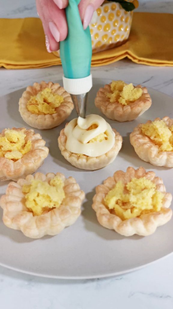 Uma vez prontos, retiramos do forno e deixamos esfriar, enquanto isso preparamos o creme de confeiteiro aqui como fazer. Colocamos dentro de cada cestinha de massa um pouco de pão de ló e recheamos com o creme de confeiteiro, por fim decoramos a cestinha com o pão de ló para criar o efeito mimosa. Antes de servir, polvilhe com açúcar de confeiteiro e boa degustação!