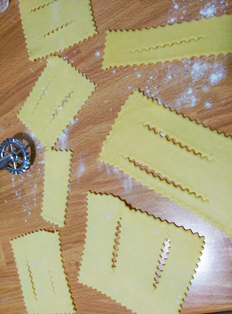 Depois de criar uma bela massa com a roda ondulada ou uma faca, cortamos retângulos e fazemos o corte clássico no centro, em vez dos retângulos podemos criar as formas que mais gostamos.
