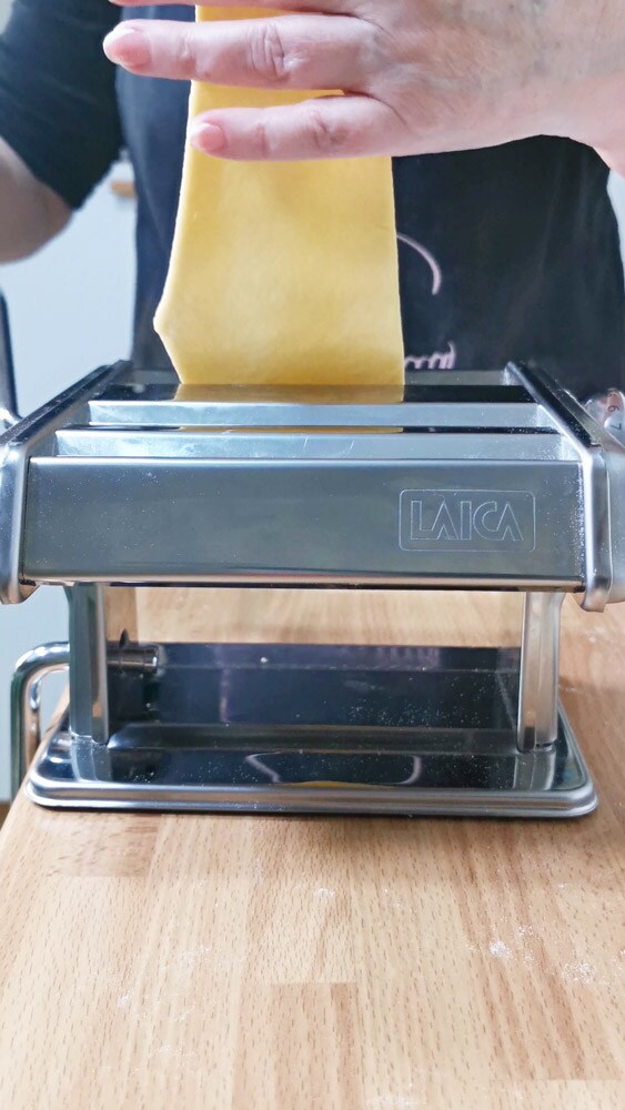 Passado o tempo, pegamos um pouco de massa e começamos a trabalhar com a máquina de massa, começando pela espessura mais larga, até terminar com a mais fina. Se não tivermos a máquina de massa, basta usar o rolo, até criar uma bela massa fina, levará um pouco mais de tempo, mas nada impossível.