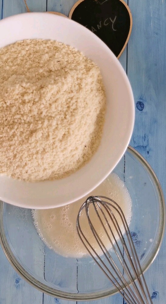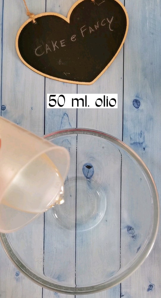 Em uma tigela grande, despeje o óleo e adicione o açúcar com o leite de amêndoas. Misture os ingredientes com um batedor manual e depois de misturá-los bem, adicione também a farinha de amêndoas.