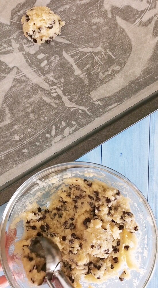 Agora, use uma colher de sorvete para criar cada biscoito, coloque os biscoitos sobre uma grelha forrada com papel manteiga e asse no forno a 180º por cerca de 15/20 minutos. Lembre-se de que temperatura e tempo de cozimento são indicativos, ajuste-se sempre com seu forno.