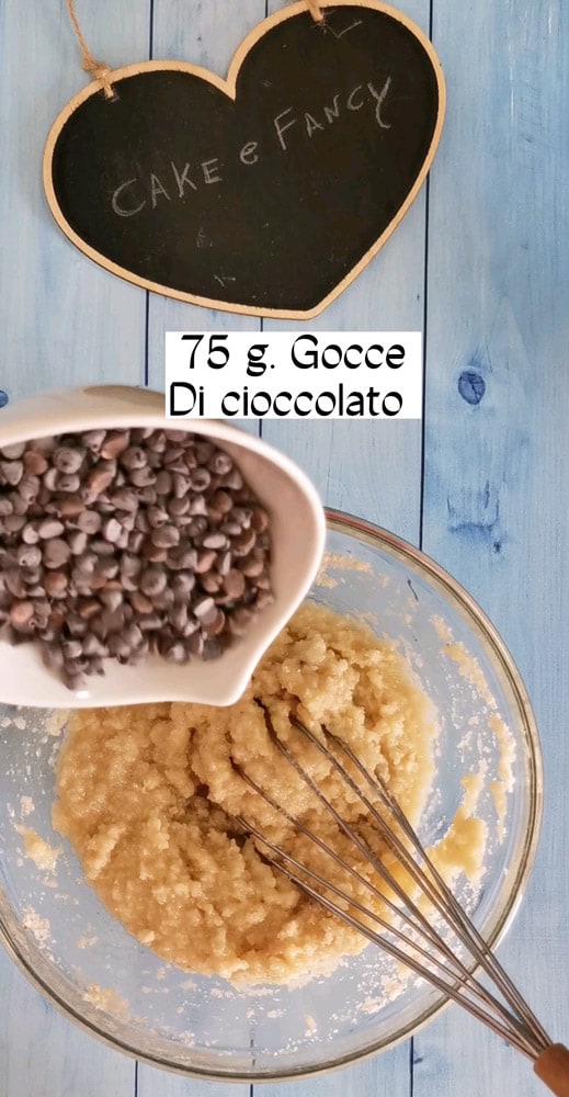 Amalgamamos bem a massa e adicionamos a colher de chá de fermento para doces, continuamos sempre a amassar. Mesmo que a massa pareça um pouco mole, não se preocupe, por fim adicione as gotas de chocolate amargo. Se não gostar do sabor amargo, também pode usar gotas de chocolate ao leite.