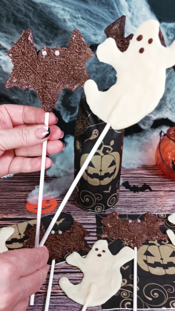 Os fantasmas e morcegos de chocolate podem ser preparados antes e armazenados à temperatura ambiente.