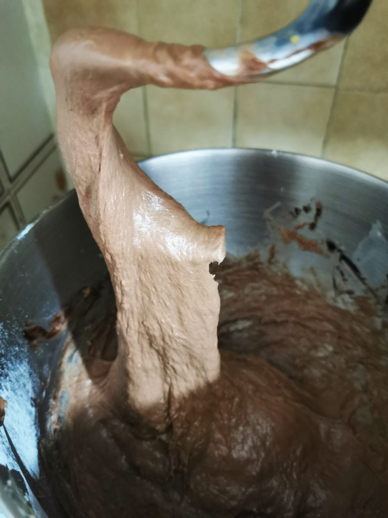 Trabalhe com a batedeira até obter uma massa bem estruturada, uma vez pronta, adicione as gotas de chocolate, misture por pouco tempo e depois deixe descansar por cerca de uma hora a 28º.
