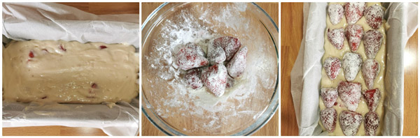 Lave 200 g de morangos e retire as folhinhas, depois corte-os em pedaços pequenos. Coloque-os numa tigela, junte duas colheres de farinha e misture. Agora incorpore-os na massa; esse procedimento ajuda a evitar que os morangos afundem no fundo.