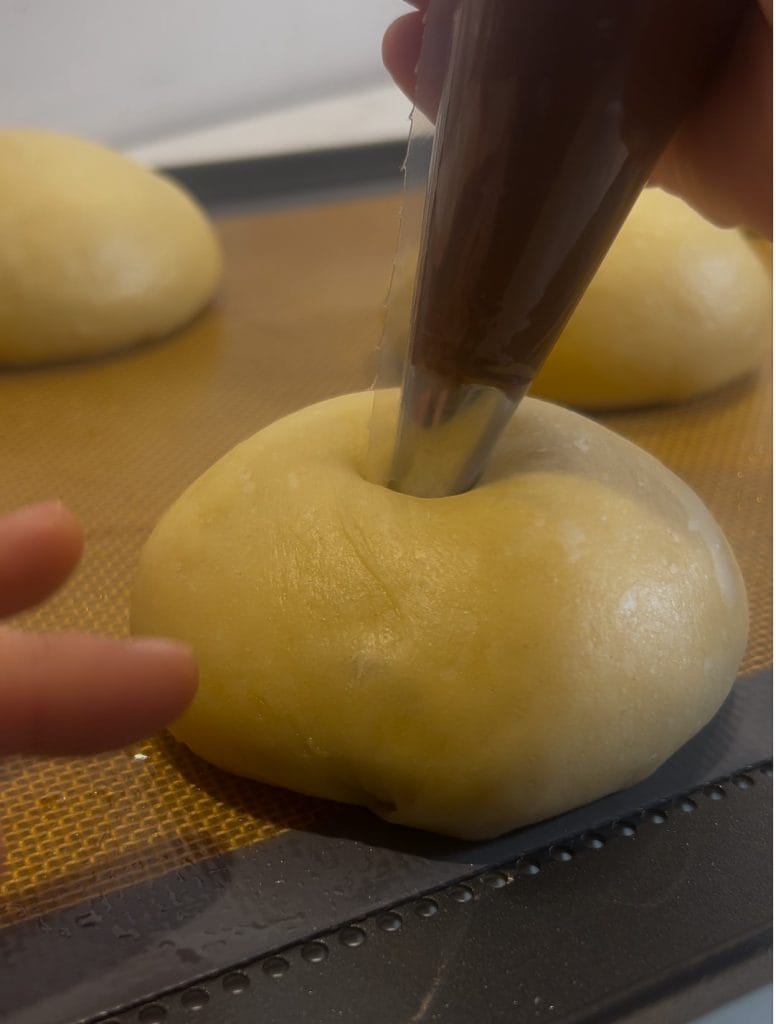 • Quando as bolinhas estiverem fermentadas e pouco antes de assar, eu as recheio usando um saco de confeitar com bico.