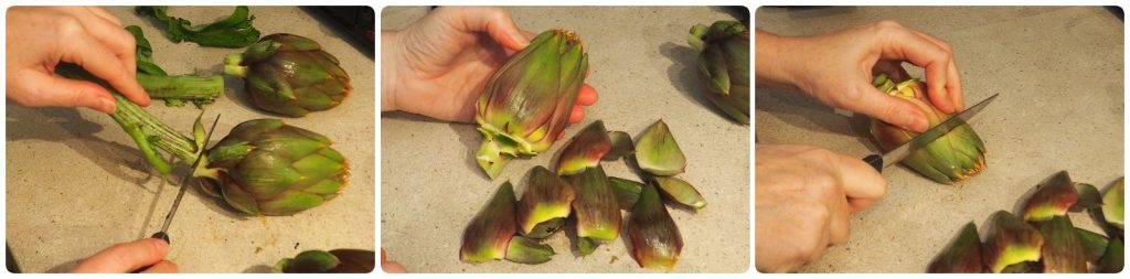 Para começar, limpe as alcachofras: corte o caule quase rente, remova as folhas externas que são as mais duras até chegar às mais claras e tenras, corte as pontas. Coloque em uma tigela com água e suco de limão para evitar que escureçam.