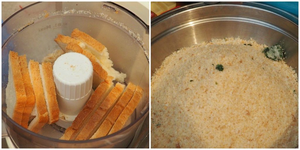 No processador, triture o pão de forma com a salsinha e o dente de alho, até ficar uma farinha grosseiramente triturada.