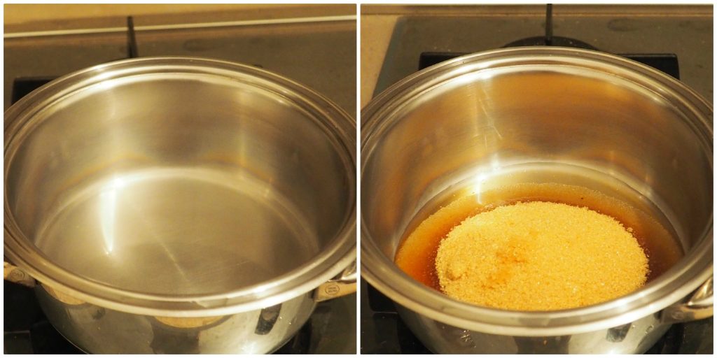 • Em uma panela pequena, coloque 4/5 colheres de água, aqueça, adicione o açúcar mascavo e deixe derreter completamente.