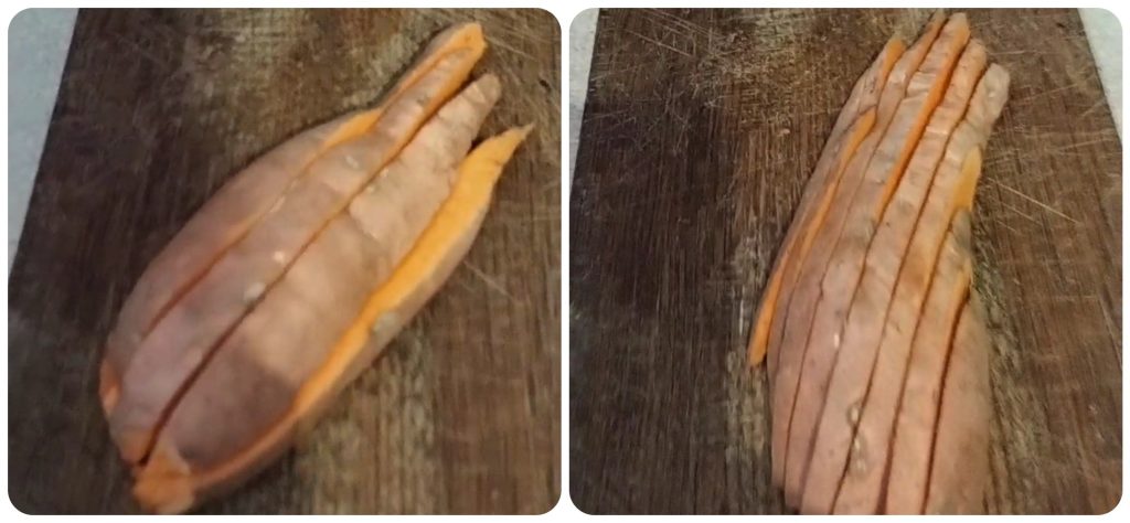 Lave e corte a batata em leque, fazendo fatias com cerca de 0,3 cm de espessura, mas sem ir até o fundo. As fatias devem ficar presas umas às outras.