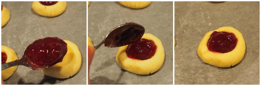 Faça uma cavidade com o polegar ou com uma tampinha redonda pressionando no centro e formando um buraco onde colocará a geleia.