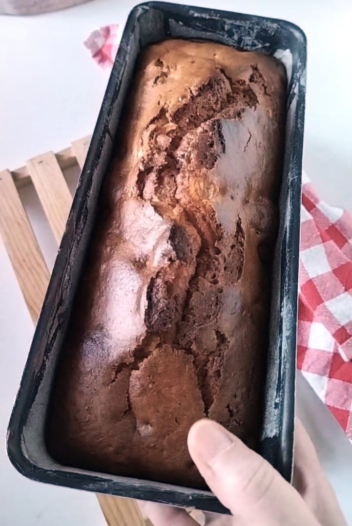 Unte e enfarinhe uma forma de bolo de 27×10 cm. Despeje a mistura dentro, tentando nivelá-la.