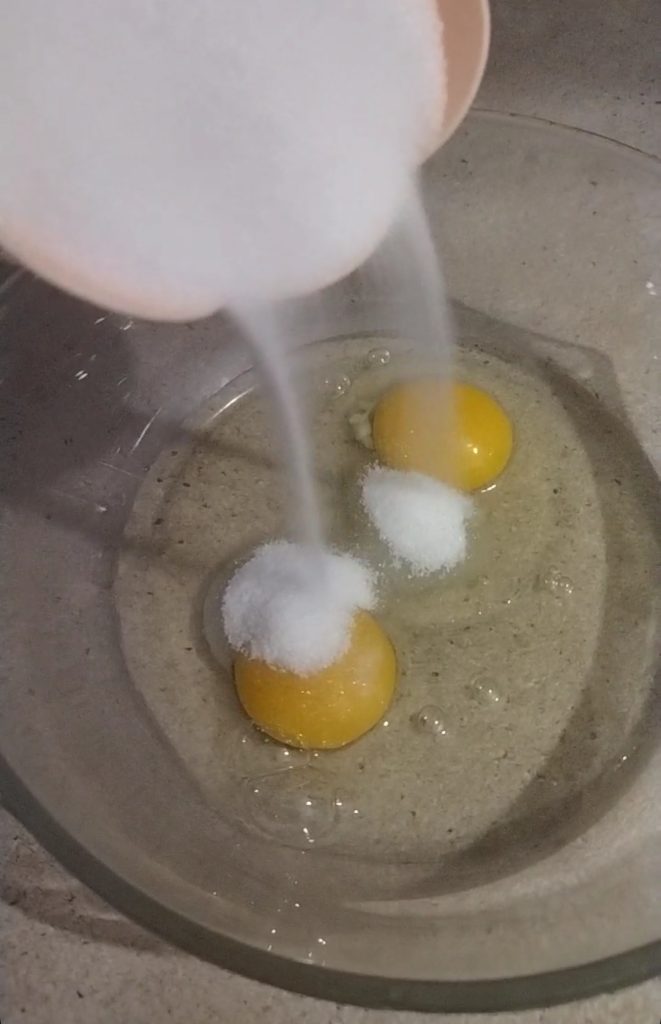 Em uma tigela, coloque os ovos com o açúcar e bata até a mistura ficar espumosa.