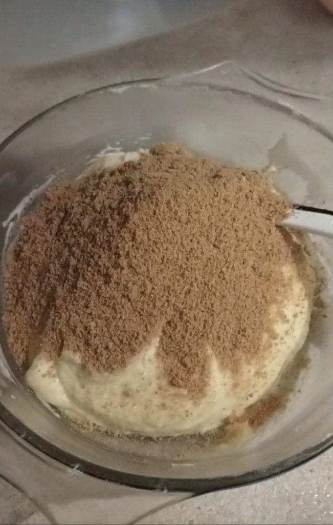 Triture finamente os biscoitos com um mixer e adicione à mistura, mexendo delicadamente para que os ingredientes fiquem bem incorporados.