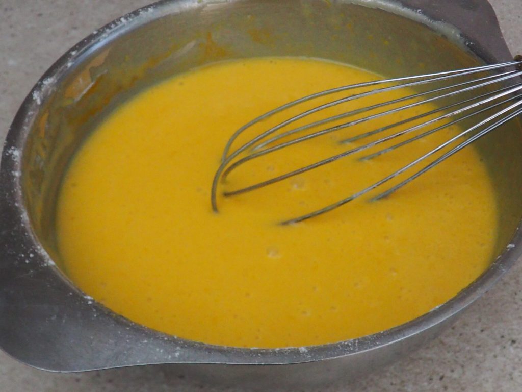 Enquanto isso, em uma tigela, coloque os ovos inteiros, o açúcar, o corante amarelo (se você quiser um creme um pouco mais colorido) e bata com um batedor até ficar claro e espumoso. Adicione a farinha peneirada aos poucos e continue batendo até que tudo esteja bem misturado.