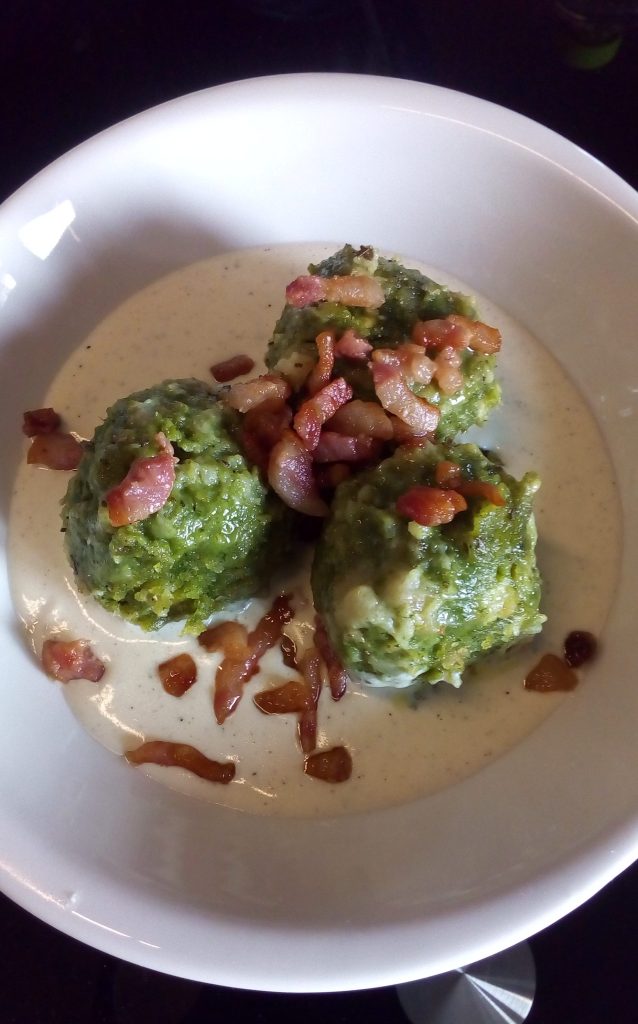 Provei os canederli no Trentino, achei realmente incríveis, macios, saborosos, não apenas um prato principal, mas um prato único verdadeiramente satisfatório. Estes Canederli com molho bechamel de parmesão e bacon irão satisfazer por seu sabor forte e estimulante.