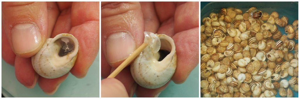 Lave a concha dos caracóis em água corrente esfregando-os entre si.