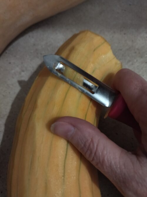 Descasque a abóbora, eu geralmente uso o descascador de batatas