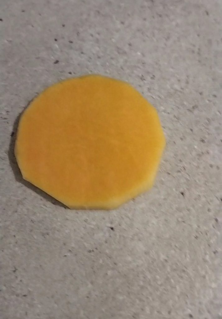 Corte a abóbora em fatias de cerca de 1 cm de espessura, deve-se obter ao todo dezesseis fatias. Coloque-as na assadeira coberta com papel manteiga.