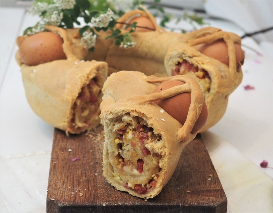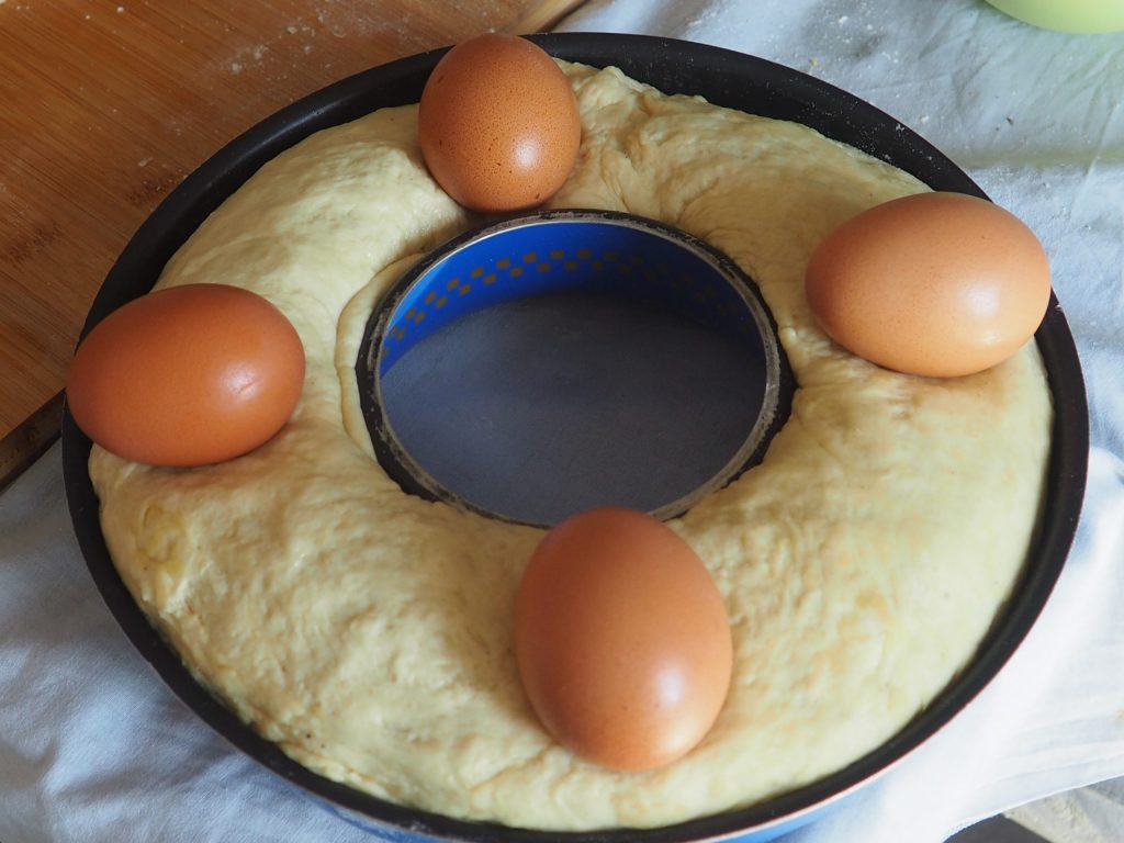 Lave bem os 4 ovos e coloque-os sobre o casatiello.