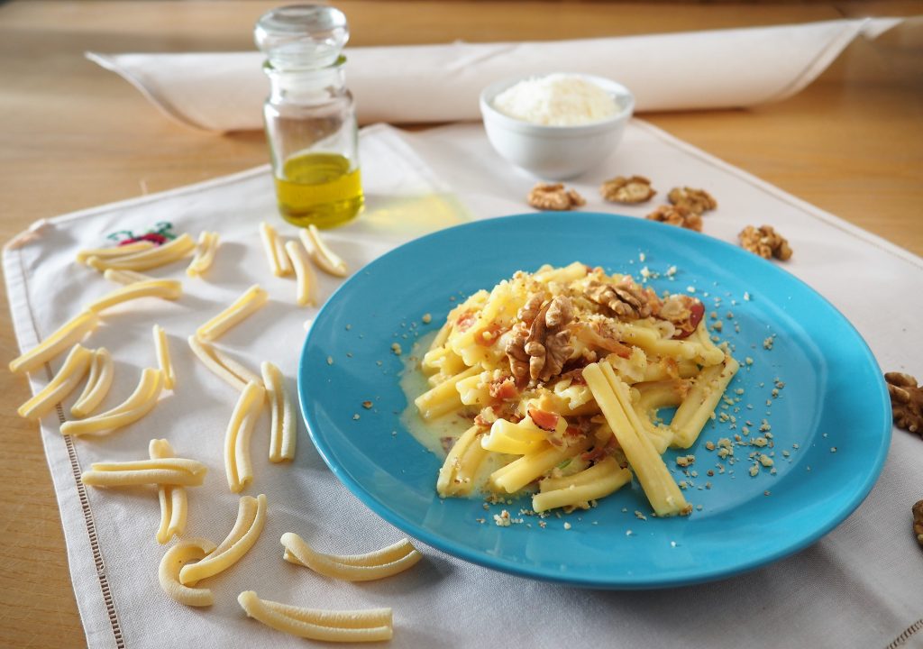 Os Caserecci com creme de leite, mascarpone, speck, açafrão e nozes são um delicioso prato principal que certamente agradará a muitos paladares. Uma mistura de creme de leite, mascarpone, speck, açafrão e uma pitada de nozes picadas para dar uma crocância agradável!