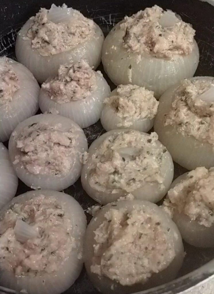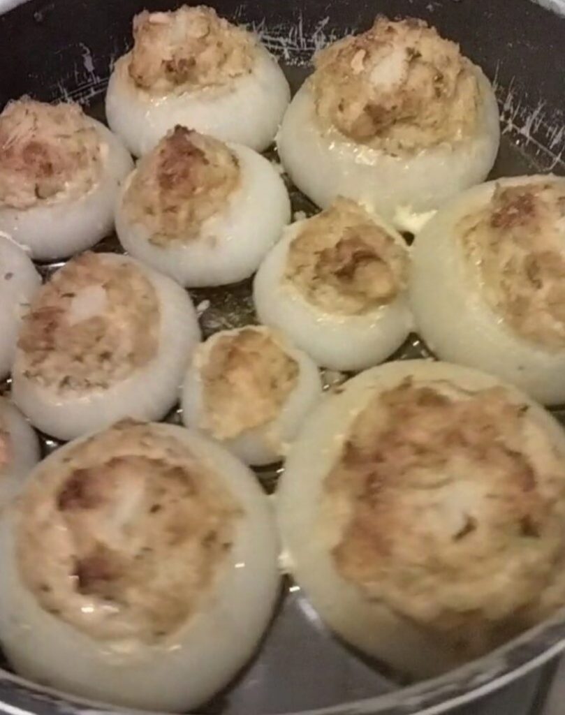 Consegui cerca de 1 kg de recheio, com 500 g preenchi os 4 anéis externos de cebola, com o restante outros 8-9 anéis menores, retirados do interior da cebola.
