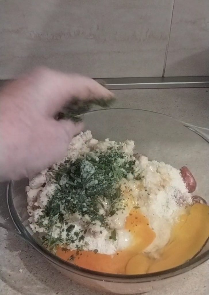 Enquanto isso, prepare o recheio. Coloque em uma tigela a linguiça esfarelada, adicione o pão seco previamente embebido no leite, os ovos, o parmesão, a salsinha, o sal, a pimenta e misture bem para amalgamar os ingredientes. Se estiver muito mole, adicione um pouco de farinha de rosca, a mistura deve ficar macia, mas bem ligada.