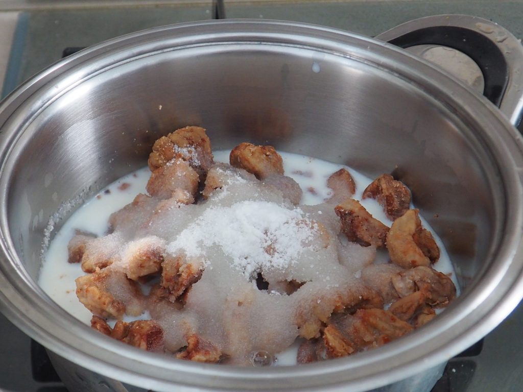 • Em uma panela coloque as castanhas já cozidas, o açúcar, a baunilha, o leite e cozinhe em fogo baixo por pelo menos 15 minutos.