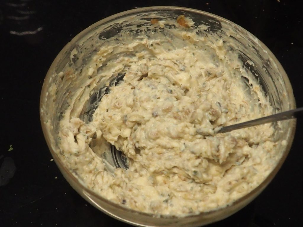 Em uma tigela, coloque os cogumelos, adicione o mascarpone, o queijo ralado, a pimenta e misture bem.