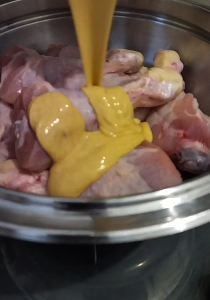 Cubra bem as coxas com a mistura de iogurte. Você pode deixar descansar a noite toda, algumas horas ou, se estiver com pressa, apenas por alguns minutos.