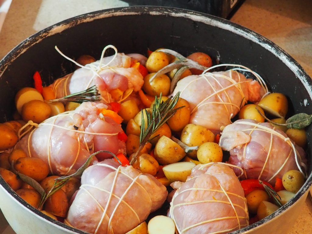 Agora pegue uma coxa desossada, recheie com alguns pedaços de pimentão, uma azeitona e meia, uma fatia de queijo cortada em palitos e feche tudo com barbante para assados.