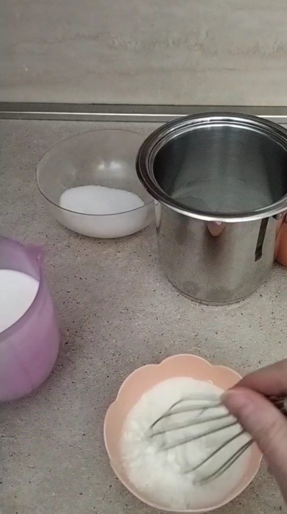 • Em uma tigela, coloque 50 ml de leite (retirados do total) com a maizena, misture com um batedor até dissolver o amido de milho.