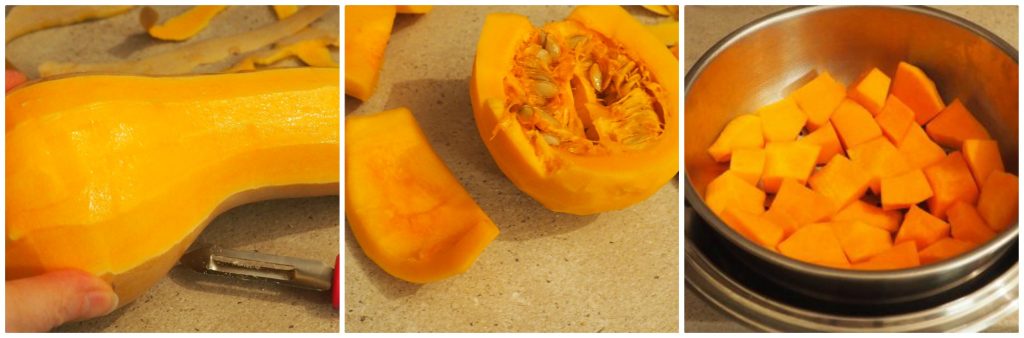 Limpe a abóbora, retire a casca (eu uso um descascador) e as sementes.