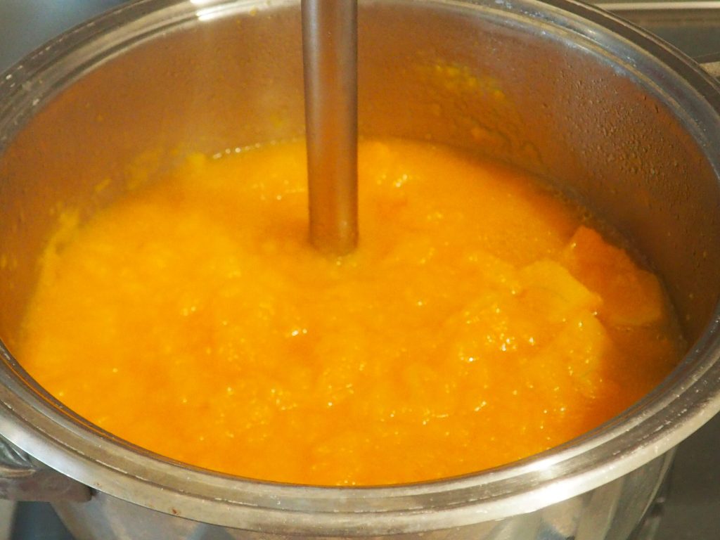 Com um mixer de imersão, bata bem a abóbora até que fique cremosa. Se necessário, ajuste o sal, adicione a noz-moscada ralada e misture bem.